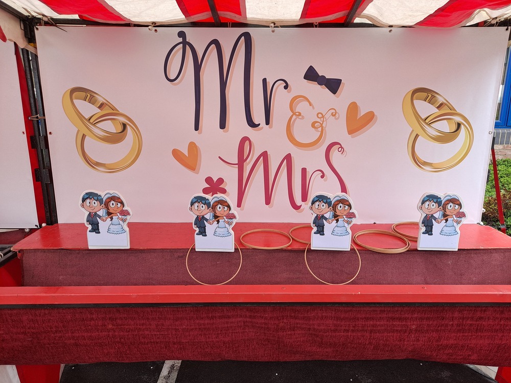Add a touch of love and laughter to your celebration with our Bride & Groom Hoopla rental—a romantic twist on the classic fairground game! This charming side stall invites guests to toss hoops over beautifully themed bride and groom figures, making it a delightful attraction for weddings, engagement parties, Valentine’s events, and family fun days. Bride & Groom Hoopla is guaranteed to draw a crowd, spark friendly competition, and create unforgettable memories for all ages.