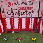 Elegant, wedding-themed coconut shy setup with “We Will Be Together Forever” signage